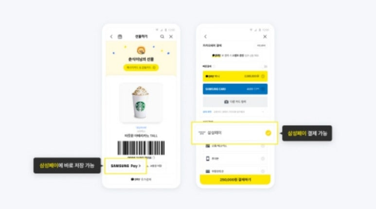이번에는 카톡에서 선물받은 기프티콘을 삼성페이로 쉽게 쓸수있게 삼성과 카카오와 손을 잡았습니다.