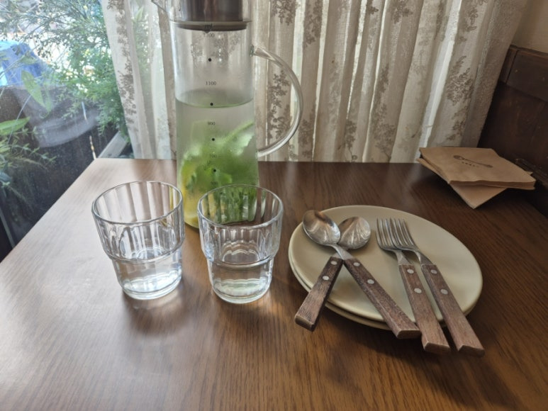 테이블에 앉으니 상큼한 레몬물과 기본접시 포크/나이프를 세팅해주셨습니다.