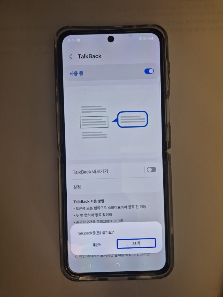 - 두 손가락으로 화면을 쭉쭉 내려 접근성 메뉴 눌러서 파란색 테두리 나온 후