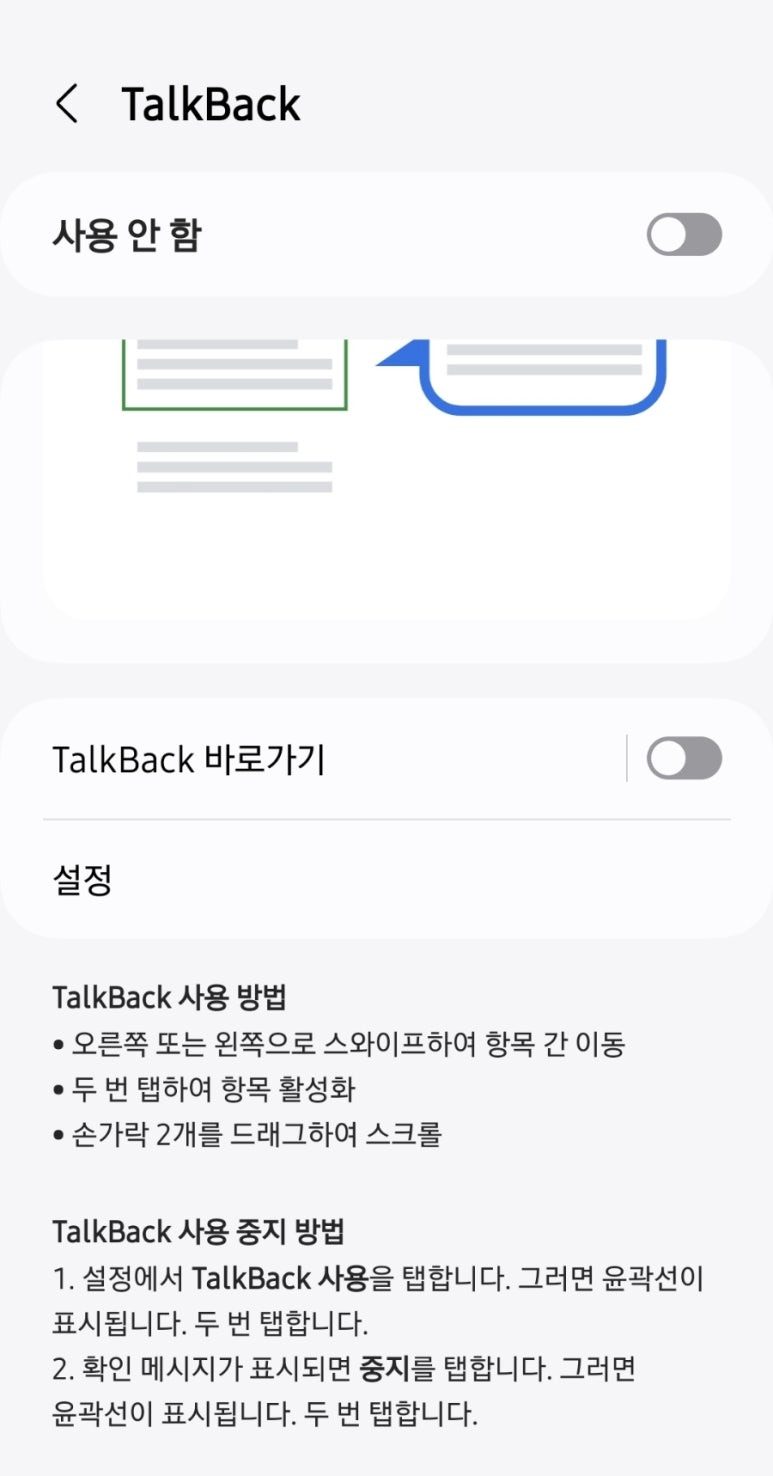 - Talk Back 토크백 (신 모델) 또는 스크린리더( 구 모델) 실행