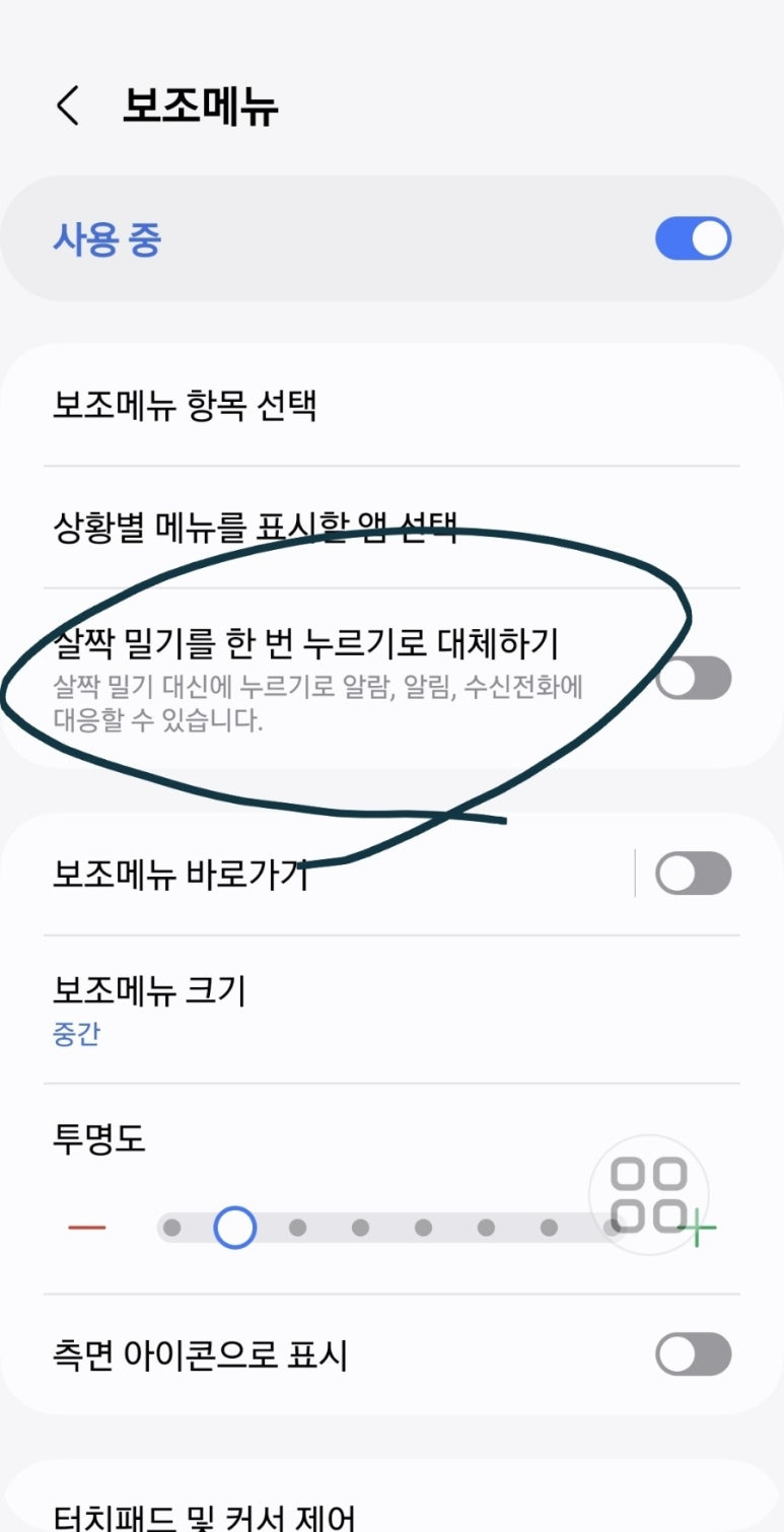 설정 - 접근성 - 입력 및 동작 - 보조메뉴 - 살짝 밀기로 한번 누르기로 대체하기