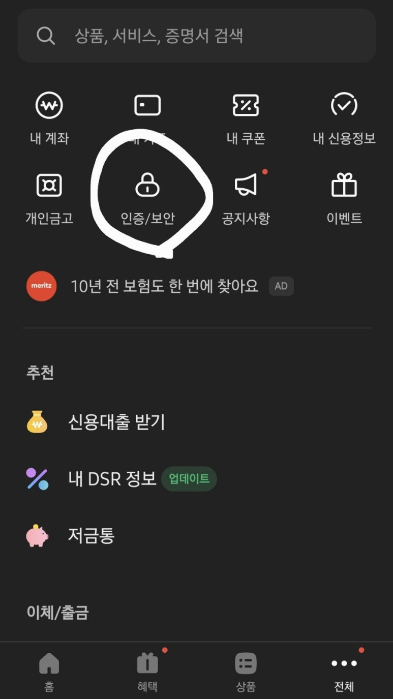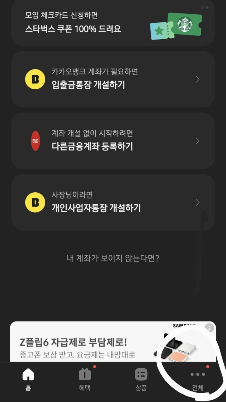2.카카오뱅크에서 오른쪽 하단 아래 점 세개 전체 버튼 터치