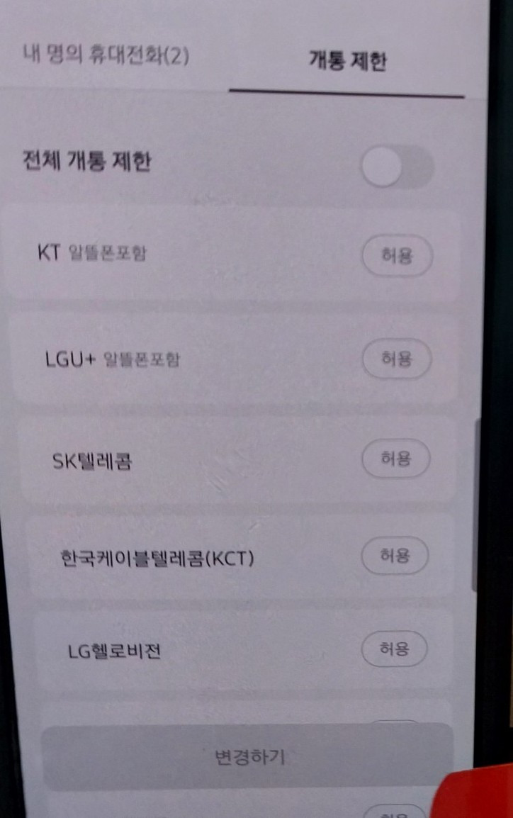이 화면에서 개통제한을 풀수도 있고 반대로 개통제한을 걸어 놓을수도 있습니다.